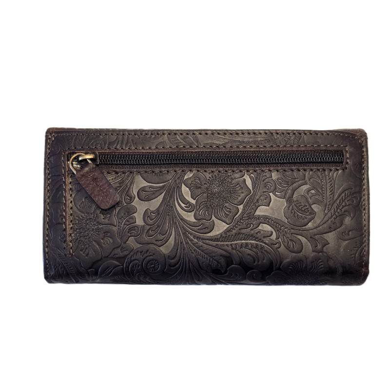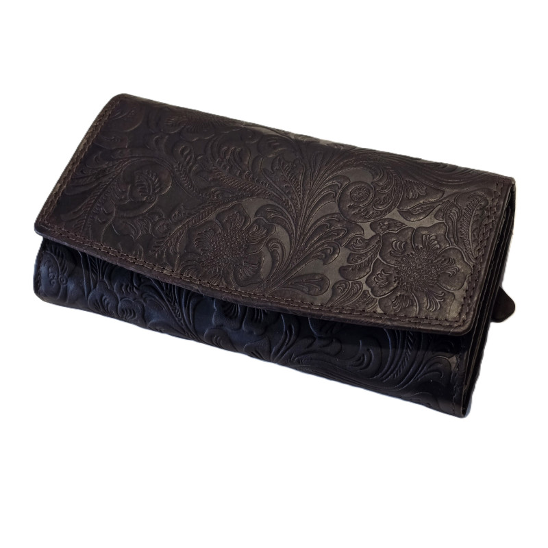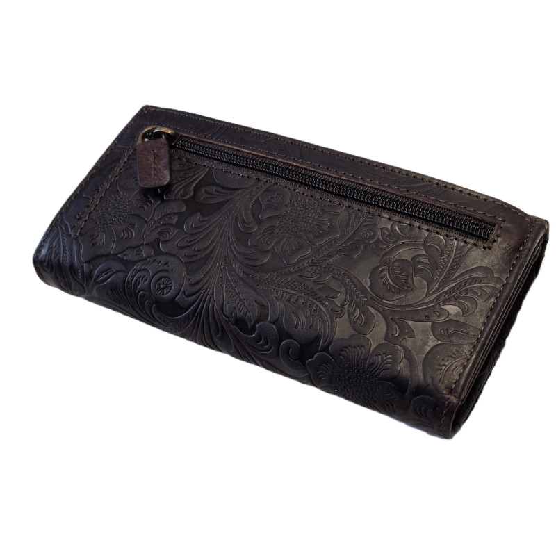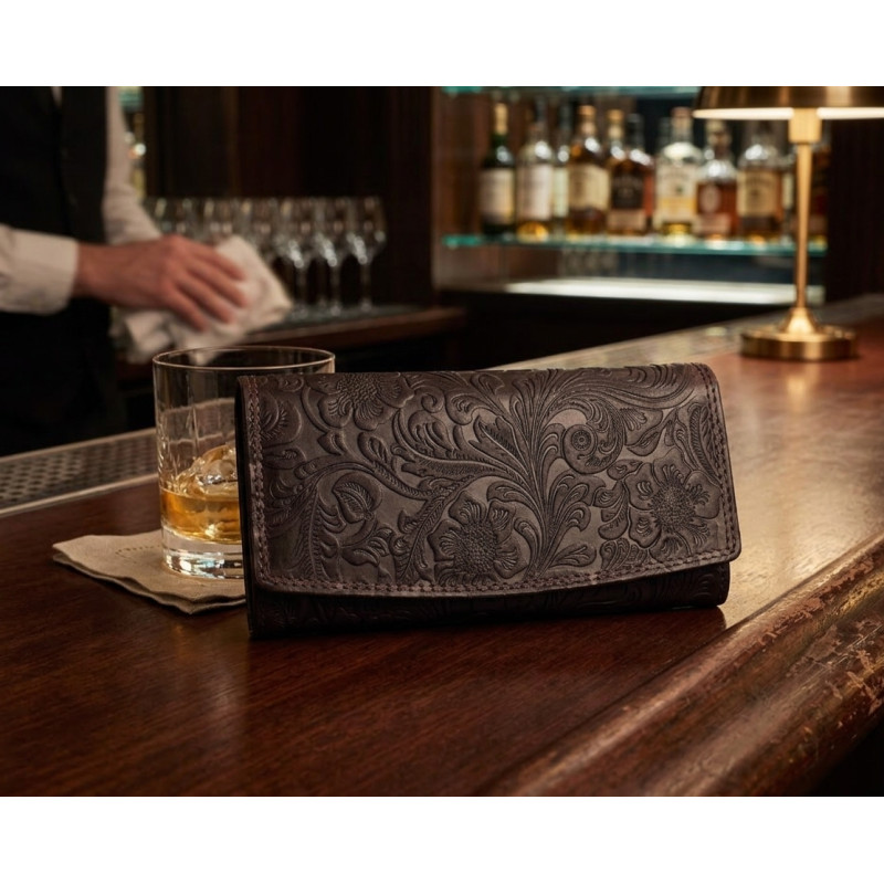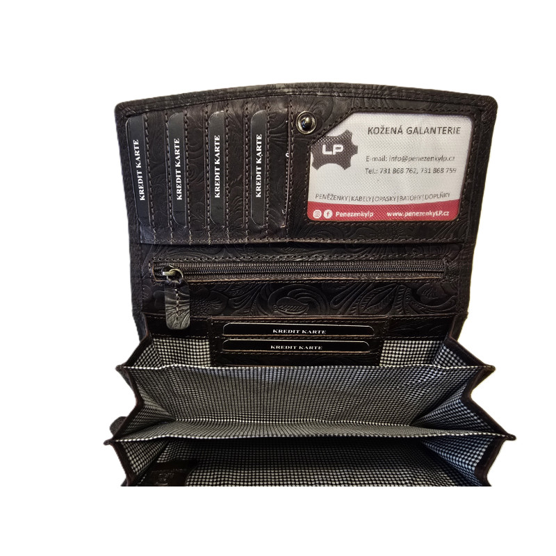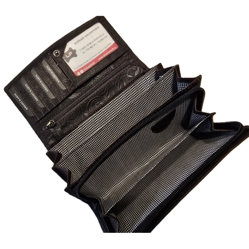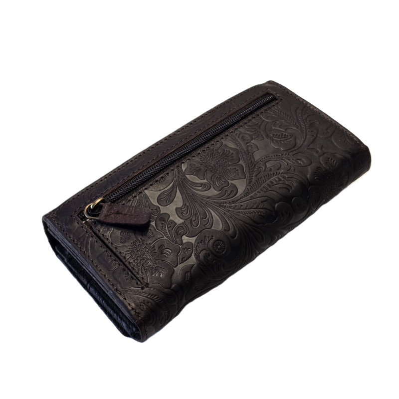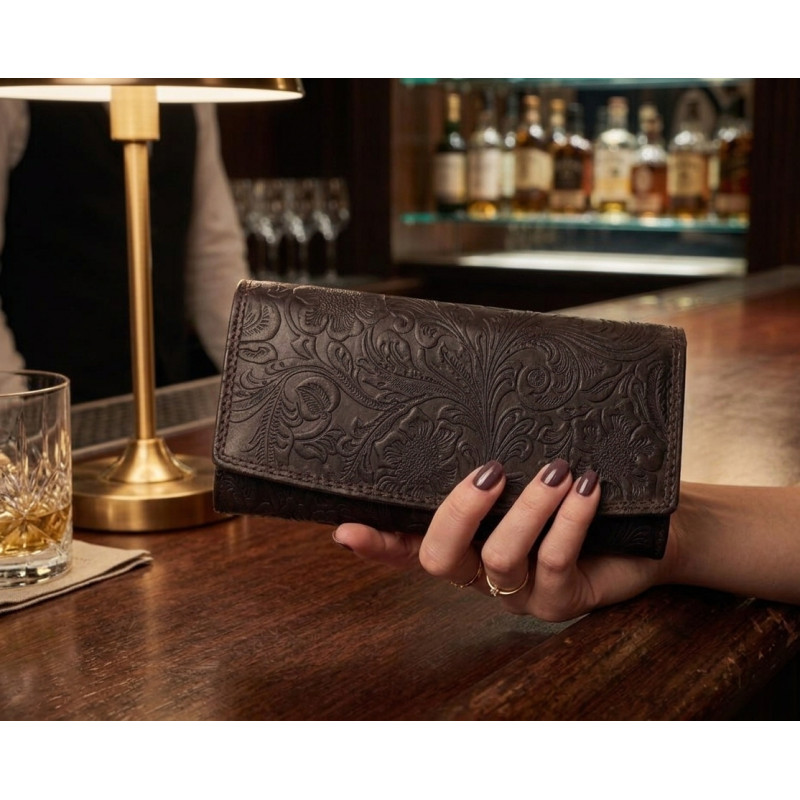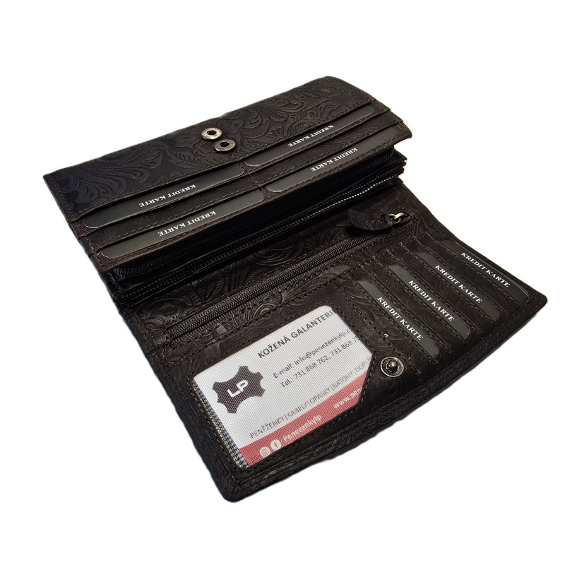 Kožená peněženka ROMANCE je skvělý společník, který vás reprezentuje na každém kroku. Moment kdy v tichém baru položíte ruku na barovou desku a pod prsty ucítíte hluboký reliéf, ručně tepané kůže. Je to vůně pravé usně, která vás nadchne pokaždé, když jí vytáhnete z kabelky. Poctivá hovězí kůže která neškrábe, nepraská a neloupe se. Florální motiv kůže není potisk jako u levných napodobenin, takže vzor květů cítíte bříšky prstů. Tmavě hnědý odstín jsme vyladili, aby připomínal oblíbenou hořkou čokoládu.