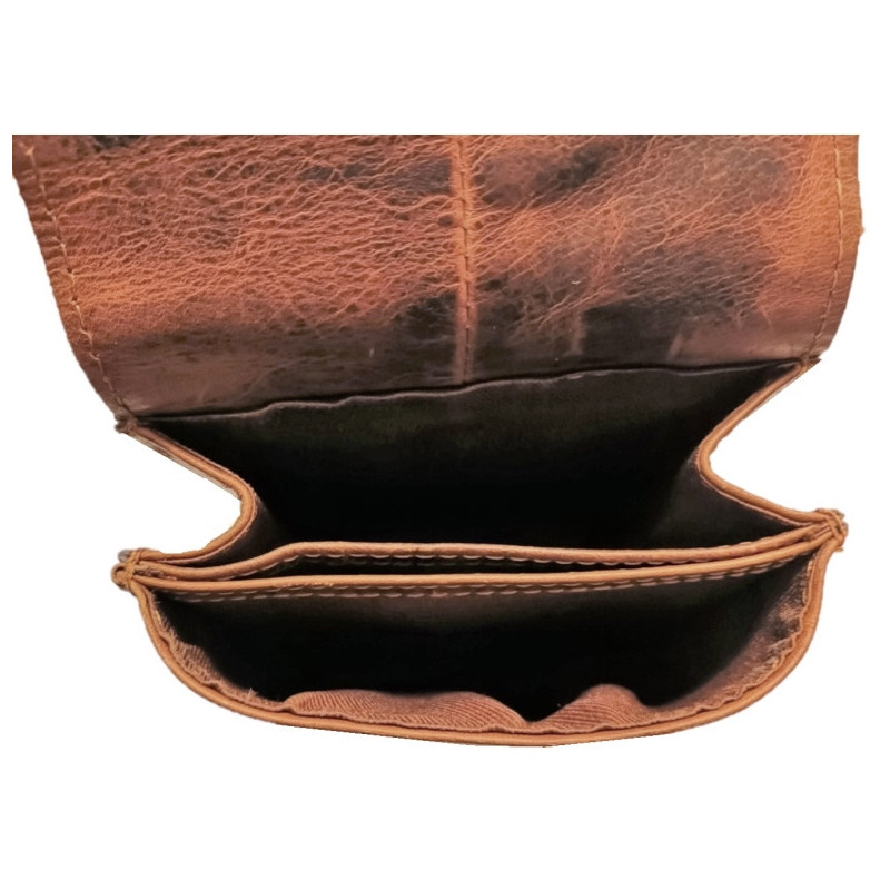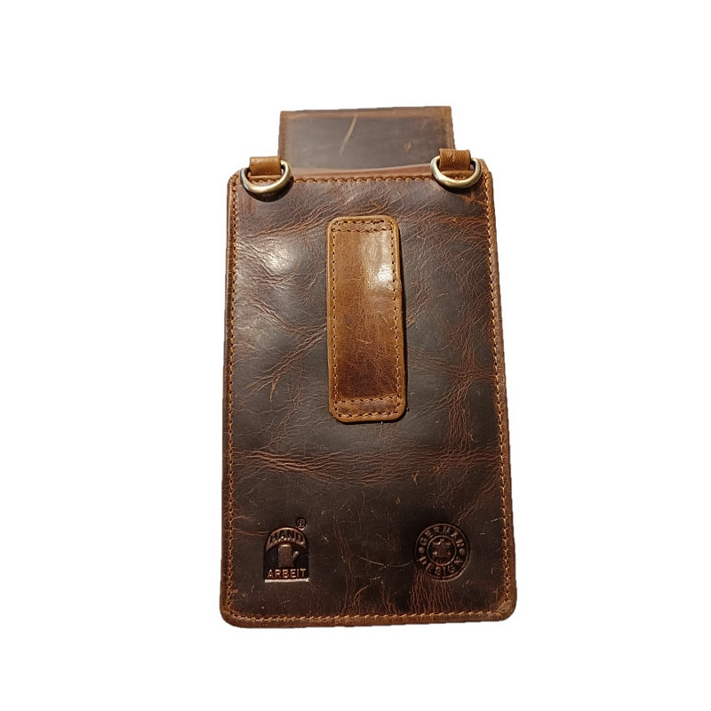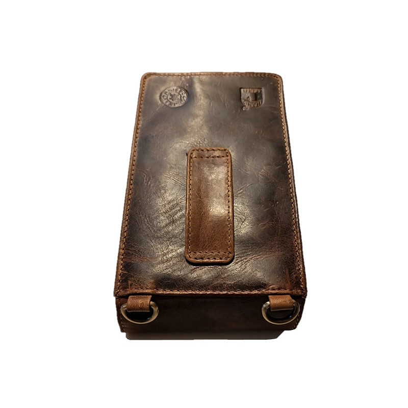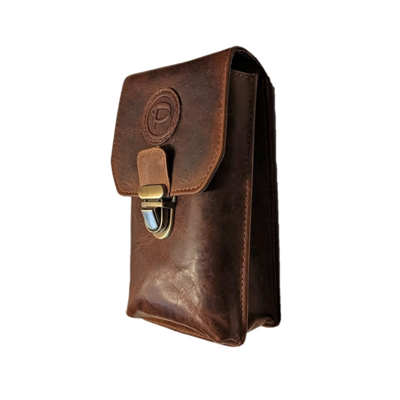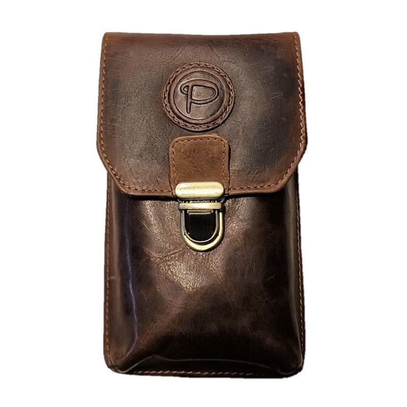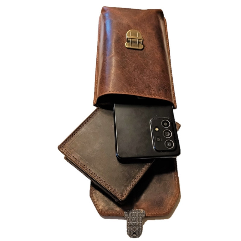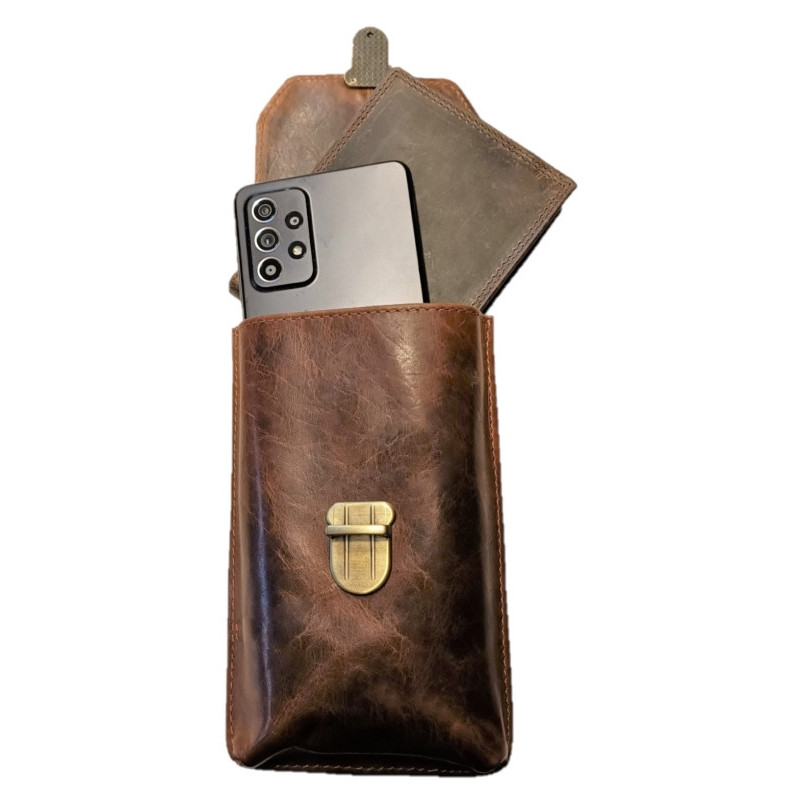 Kožené pouzdro na telefon, peněženku a další drobnosti. Ručně vyrobeno z kvalitní, hluboce hnědé kůže s patinou , proto kůže bude používáním jen krásnější. Hlavní přihrádka pojme většinu moderních smartphonů. Pouzdro je navíc vybaveno dvěma komorami, které oddělují telefon od peněženky nebo jiných drobností. Bezpečné zapínání přední klopy zajišťuje stylový zámek v barvě staromosazi. Na zadní straně je pevné poutko pro klasické nošení na opasku. Přiložený popruh umožňuje nošení na rameni jako crossbody.