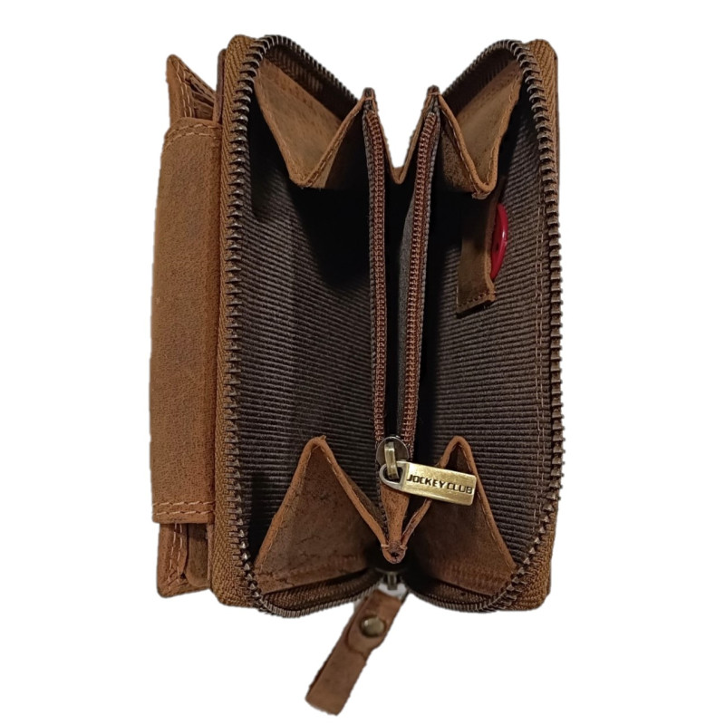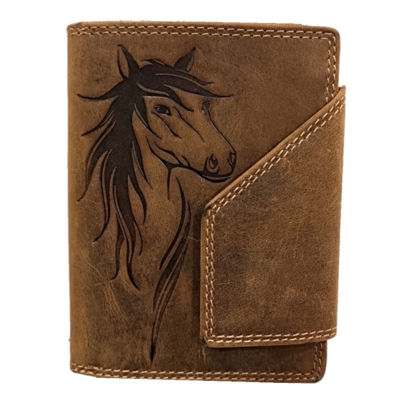 Kožená elegantní peněženka v rustikální hovězí, broušené kůži, je orientována na výšku a její přední strana je zdobena velmi pečlivě vyraženým motivem koňské hlavy. Tento kousek udělá radost každému koňákovi a všem co mají rádi kvalitní, přírodní materiály. Výhodou peněženky je skvělý design, krásná pevná kůže a kvalitní zpracování.