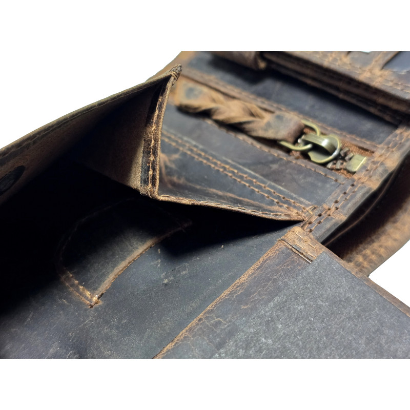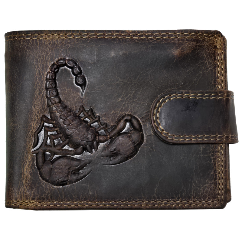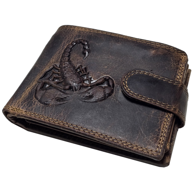 Kožená peněženka SCORPIO, charakter který nezkrotíte. Zapomeňte na uhlazenou nudu z nákupních center. Tato peněženka není jen pouzdro na peníze, je to kus poctivého řemesla. Dominantní štír je vyjádřením síly, ochrany a nekompromisního stylu. Peněženka z pravé hovězí kůže je odolná a díky unikátní technologii RFID bezpečná. Nabídne mnoho přihrádek na kreditní karty, doklady, bankovky i mince. Ideální pro ty, kteří hledají funkční peněženku s praktickým uspořádáním.