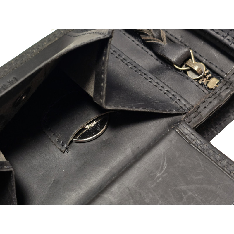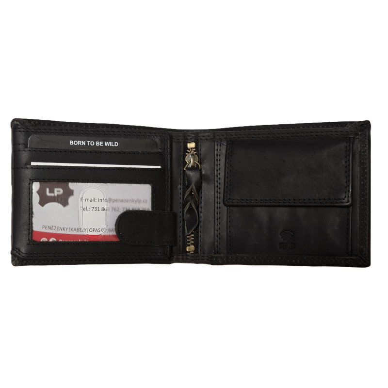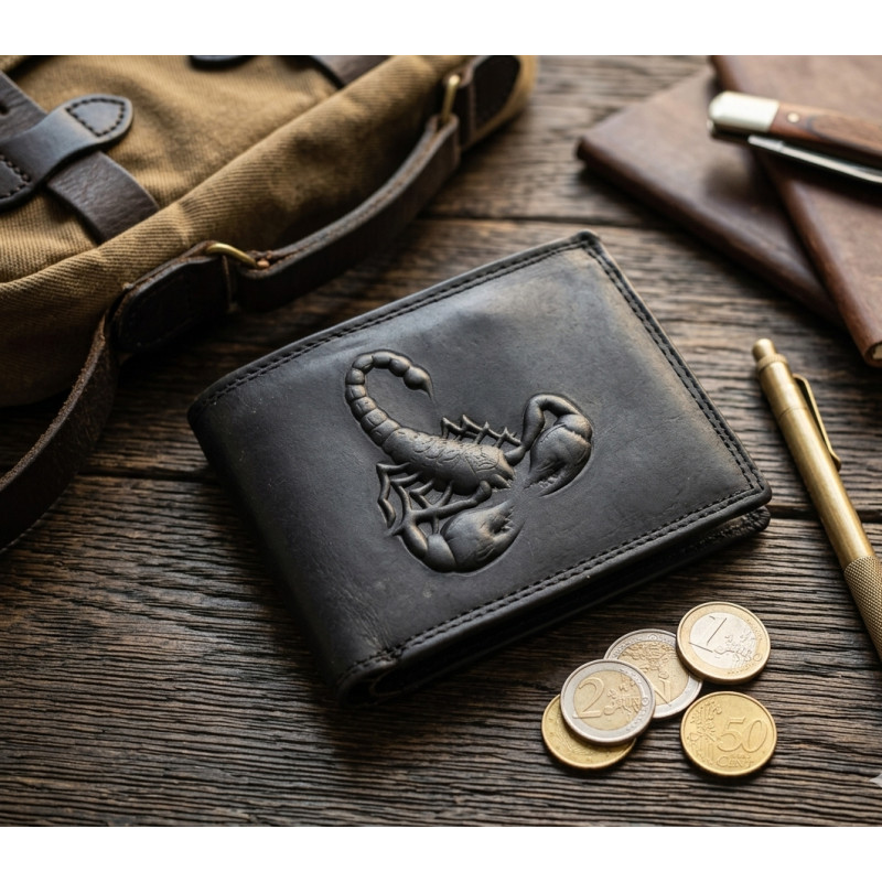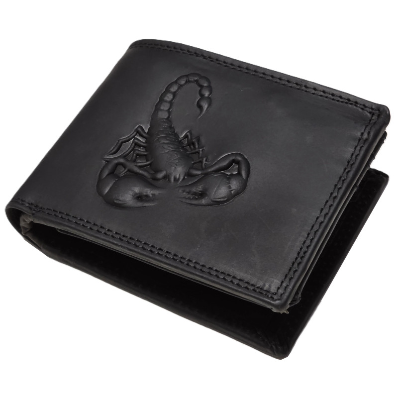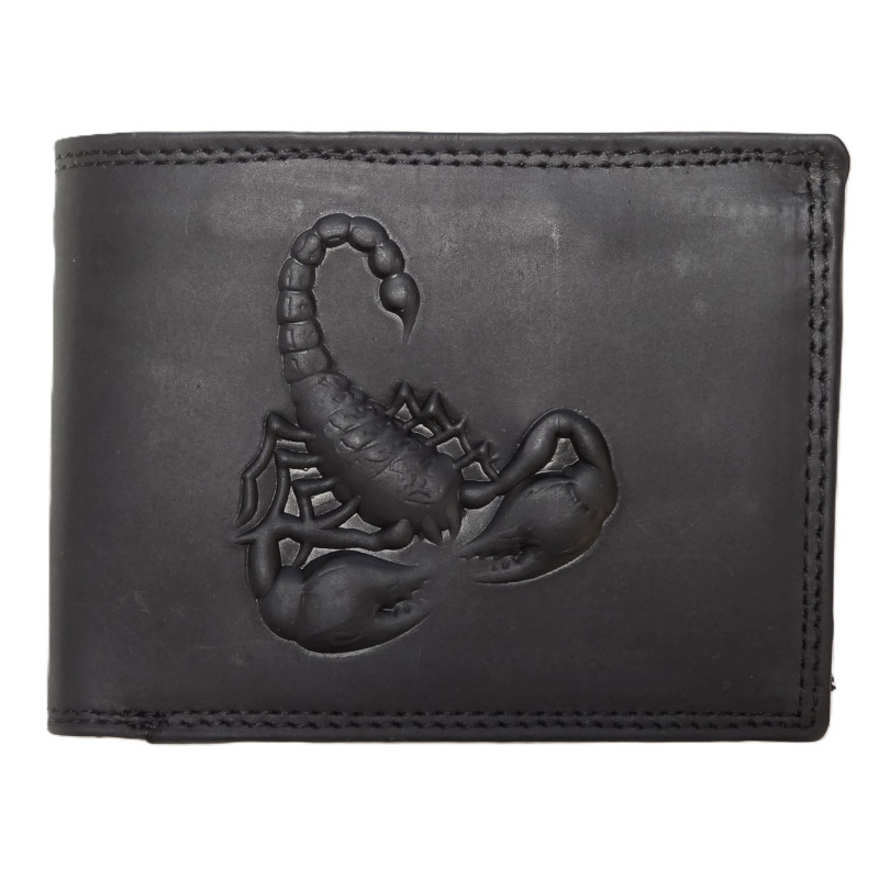 Kožená peněženka s dominantním motivem štíra, vystupující z masivní černé kůže symbolizuje odolnost, hrdost a vytrvalost. Není to jen potisk, který by časem vybledl. Je to reliéf který s vámi bude stárnout do krásy. Peněženka je vyrobena z poctivé, pevné hověziny. Tmavá barva přírodní broušené kůže, není lesklá ale matná a působí luxusně i zároveň drsně. Dvojité prošití nejenže skvěle vypadá, ale zajistí že se peněženka nerozpadne ani při pořádném nákladu bankovek. Tento kousek je určen pro rockery, štíry, motorkáře a zkrátka pro ty co se nebojí vyčnívat. Peněženka disponuje s dostatečnou kapacitou pro vaše kreditní karty a bankovky, které budou díky unikátní technologii RFID, bezpečně chráněny proti digitálním zlodějům.