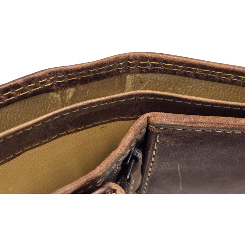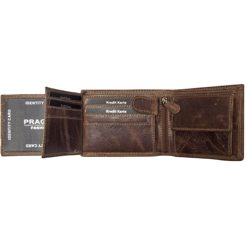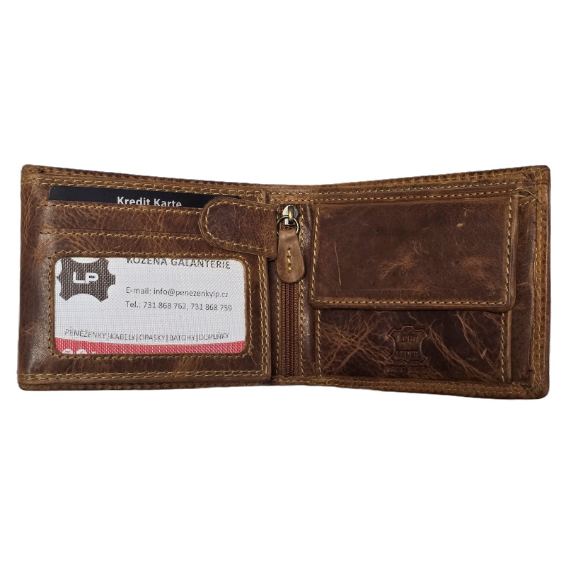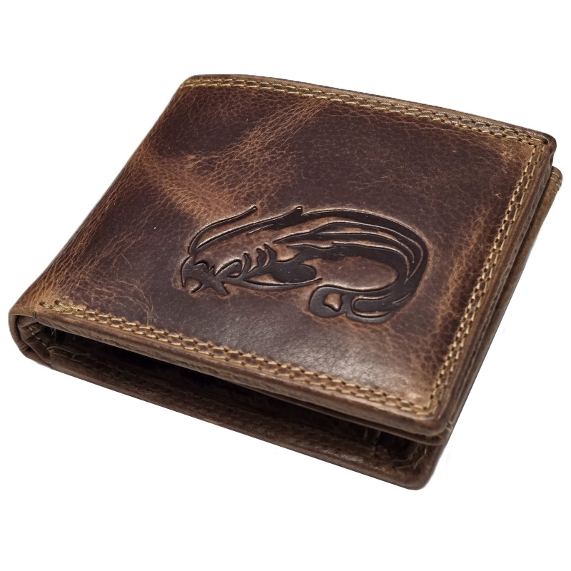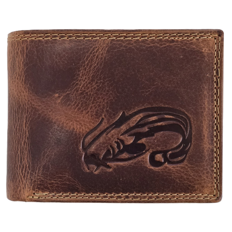 Pánská kožená peněženka s motivem dravce. Dokonalý doplněk nejen pro milovníky přírody a rybolovu. Tato stylová pánská peněženka z pravé kůže zaujme na první pohled svým precizně vyraženým motivem dravé ryby. Díky vintage vzhledu a preciznímu zpracování s vysokým podílem ruční práce je každý kus jedinečný. Originální dárek, kterým opravdu okouzlíte. Peněženka je vyrobena z kvalitní hovězí kůže. Kontrastní prošití pevnou nití, zvýrazňuje kvalitní zpracování. Peněženka poskytuje dostatek přihrádek pro vaše karty, doklady, bankovky i mince.